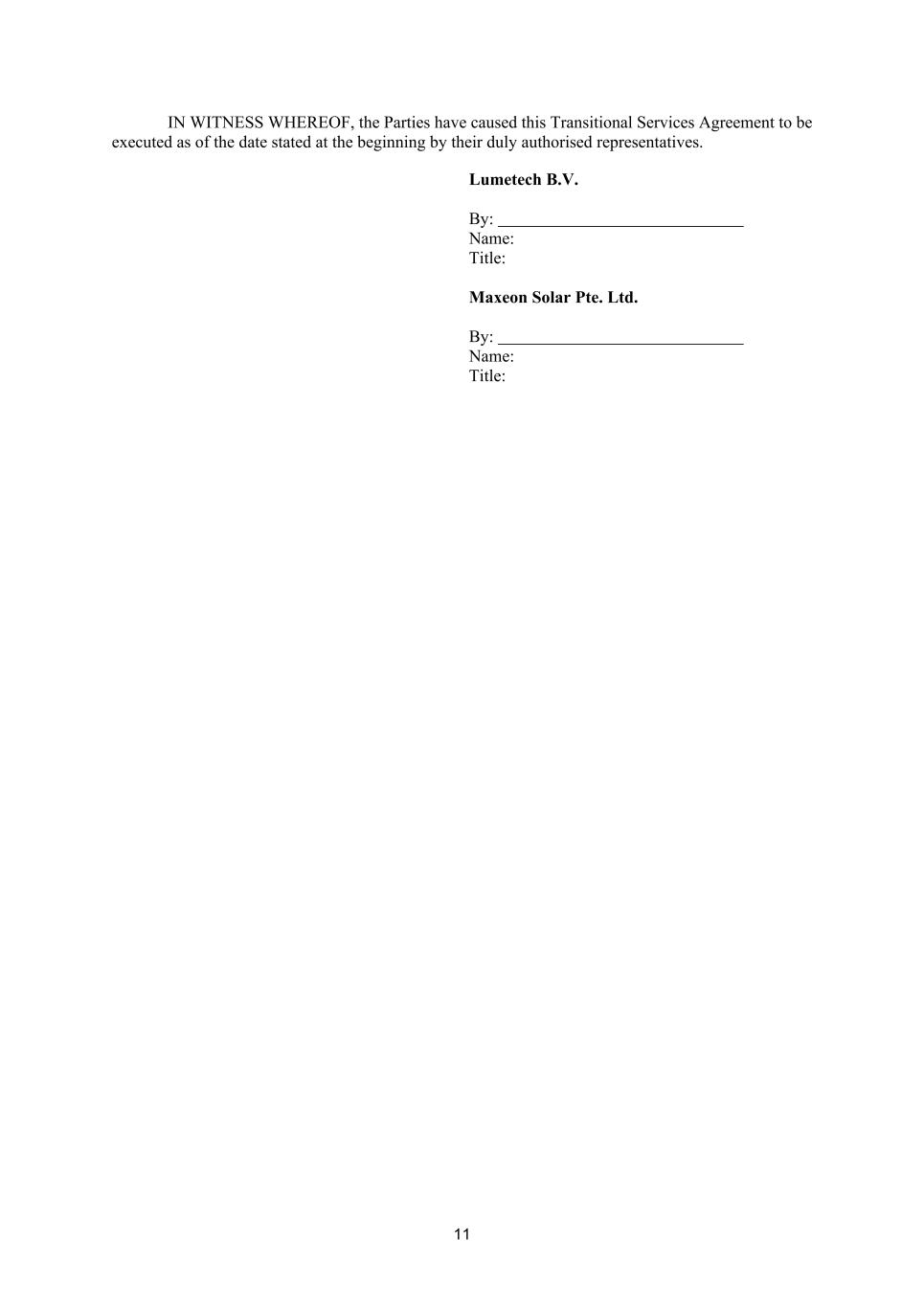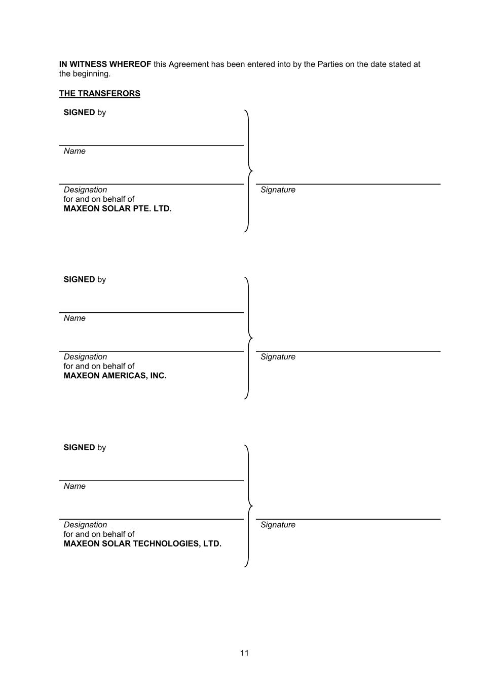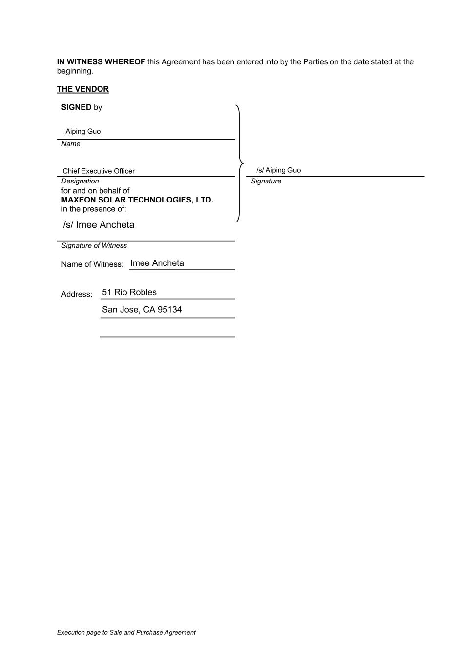 Execution page to Sale and Purchase Agreement IN WITNESS WHEREOF this Agreement has been entered into by the Parties on the date stated at the beginning. THE VENDOR SIGNED by Name Designation Signature for and on behalf of MAXEON SOLAR TECHNOLOGIES, LTD. in the presence of: Signature of Witness Name of Witness: Address: Aiping Guo Chief Executive Officer /s/ Aiping Guo /s/ Imee Ancheta Imee Ancheta 51 Rio Robles San Jose, CA 95134