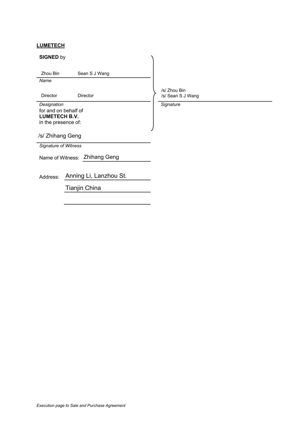 Execution page to Sale and Purchase Agreement LUMETECH SIGNED by Name Designation Signature for and on behalf of LUMETECH B.V. in the presence of: Signature of Witness Name of Witness: Address: Zhou Bin Sean S J Wang Director Director /s/ Zhou Bin /s/ Sean S J Wang /s/ Zhihang Geng Zhihang Geng Anning Li, Lanzhou St. Tianjin China