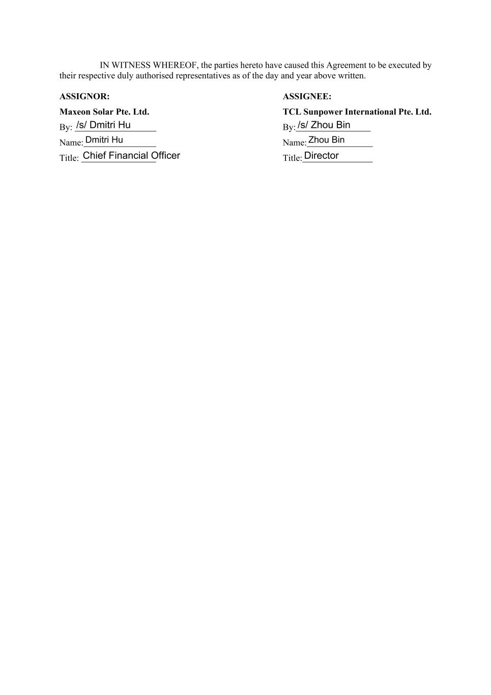 Execution page to Sale and Purchase Agreement TCL SUNPOWER SIGNED by Name Designation Signature for and on behalf of TCL SUNPOWER INTERNATIONAL PTE. LTD. in the presence of: Signature of Witness Name of Witness: Address: Zhou Bin Director /s/ Zhou Bin /s/ Zhihang Geng Zhihang Geng Anning Li, Lanzhou St. Tianjin China