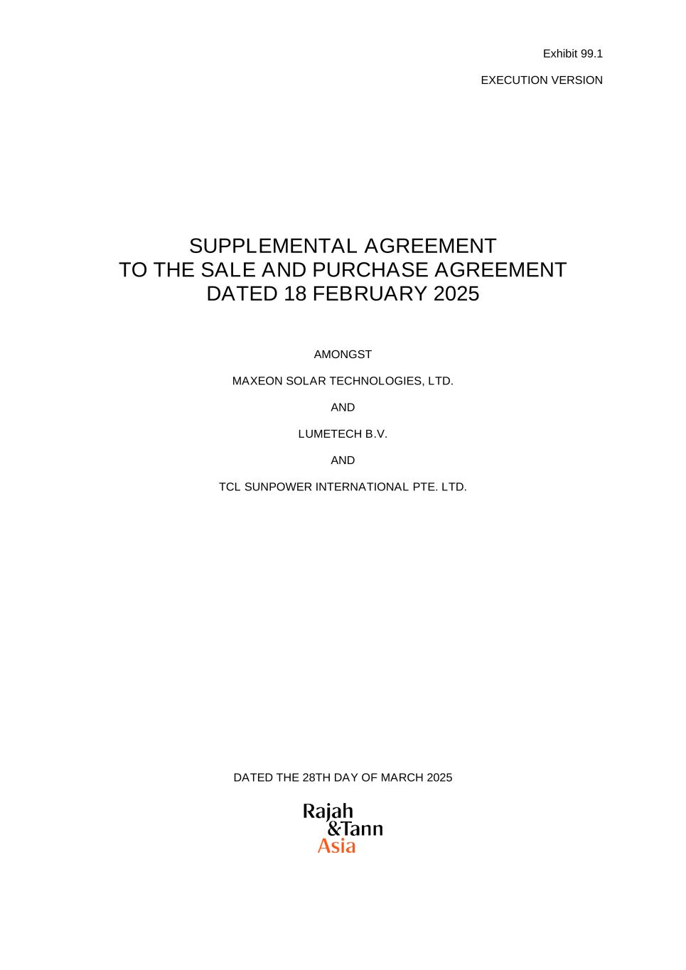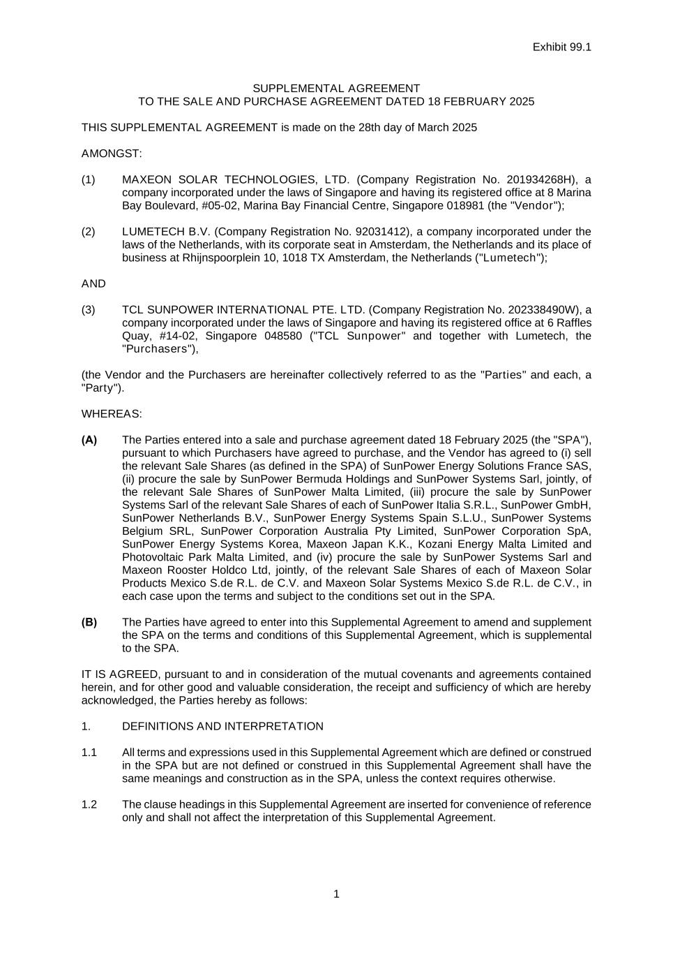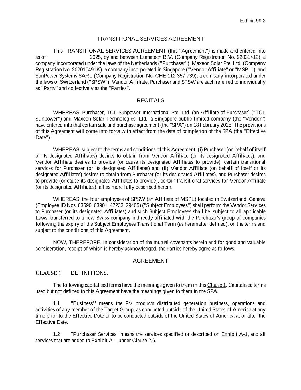 Exhibit 99.2 TRANSITIONAL SERVICES AGREEMENT This TRANSITIONAL SERVICES AGREEMENT (this "Agreement") is made and entered into as of 2025, by and between Lumetech B.V. (Company Registration No. 92031412), a company incorporated under the laws of the Netherlands ("Purchaser"), Maxeon Solar Pte. Ltd. (Company Registration No. 202010491K), a company incorporated in Singapore ("Vendor Affiliate" or "MSPL"), and SunPower Systems SARL (Company Registration No. CHE 112 357 739), a company incorporated under the laws of Switzerland ("SPSW"). Vendor Affiliate, Purchaser and SPSW are each referred to individually as "Party" and collectively as the "Parties". RECITALS WHEREAS, Purchaser, TCL Sunpower International Pte. Ltd. (an Affiliate of Purchaser) ("TCL Sunpower") and Maxeon Solar Technologies, Ltd., a Singapore public limited company (the "Vendor") have entered into that certain sale and purchase agreement (the "SPA") on 18 February 2025. The provisions of this Agreement will come into force with effect from the date of completion of the SPA (the "Effective Date"). WHEREAS, subject to the terms and conditions of this Agreement, (i) Purchaser (on behalf of itself or its designated Affiliates) desires to obtain from Vendor Affiliate (or its designated Affiliates), and Vendor Affiliate desires to provide (or cause its designated Affiliates to provide), certain transitional services for Purchaser (or its designated Affiliates) and (ii) Vendor Affiliate (on behalf of itself or its designated Affiliates) desires to obtain from Purchaser (or its designated Affiliates), and Purchaser desires to provide (or cause its designated Affiliates to provide), certain transitional services for Vendor Affiliate (or its designated Affiliates), all as more fully described herein. WHEREAS, the four employees of SPSW (an Affiliate of MSPL) located in Switzerland, Geneva (Employee ID Nos. 63590, 63901, 47233, 29405) ("Subject Employees") shall perform the Vendor Services to Purchaser (or its designated Affiliates) and such Subject Employees shall be, subject to all applicable Laws, transferred to a new Swiss company indirectly affiliated with the Purchaser's group of companies following the expiry of the Subject Employees Transitional Term (as hereinafter defined), on the terms and subject to the conditions of this Agreement. NOW, THEREFORE, in consideration of the mutual covenants herein and for good and valuable consideration, receipt of which is hereby acknowledged, the Parties hereby agree as follows. AGREEMENT CLAUSE 1 DEFINITIONS. The following capitalised terms have the meanings given to them in this Clause 1. Capitalised terms used but not defined in this Agreement have the meanings given to them in the SPA. 1.1 "Business" means the PV products distributed generation business, operations and activities of any member of the Target Group, as conducted outside of the United States of America at any time prior to the Effective Date or to be conducted outside of the United States of America at or after the Effective Date. 1.2 "Purchaser Services" means the services specified or described on Exhibit A-1, and all services that are added to Exhibit A-1 under Clause 2.6.