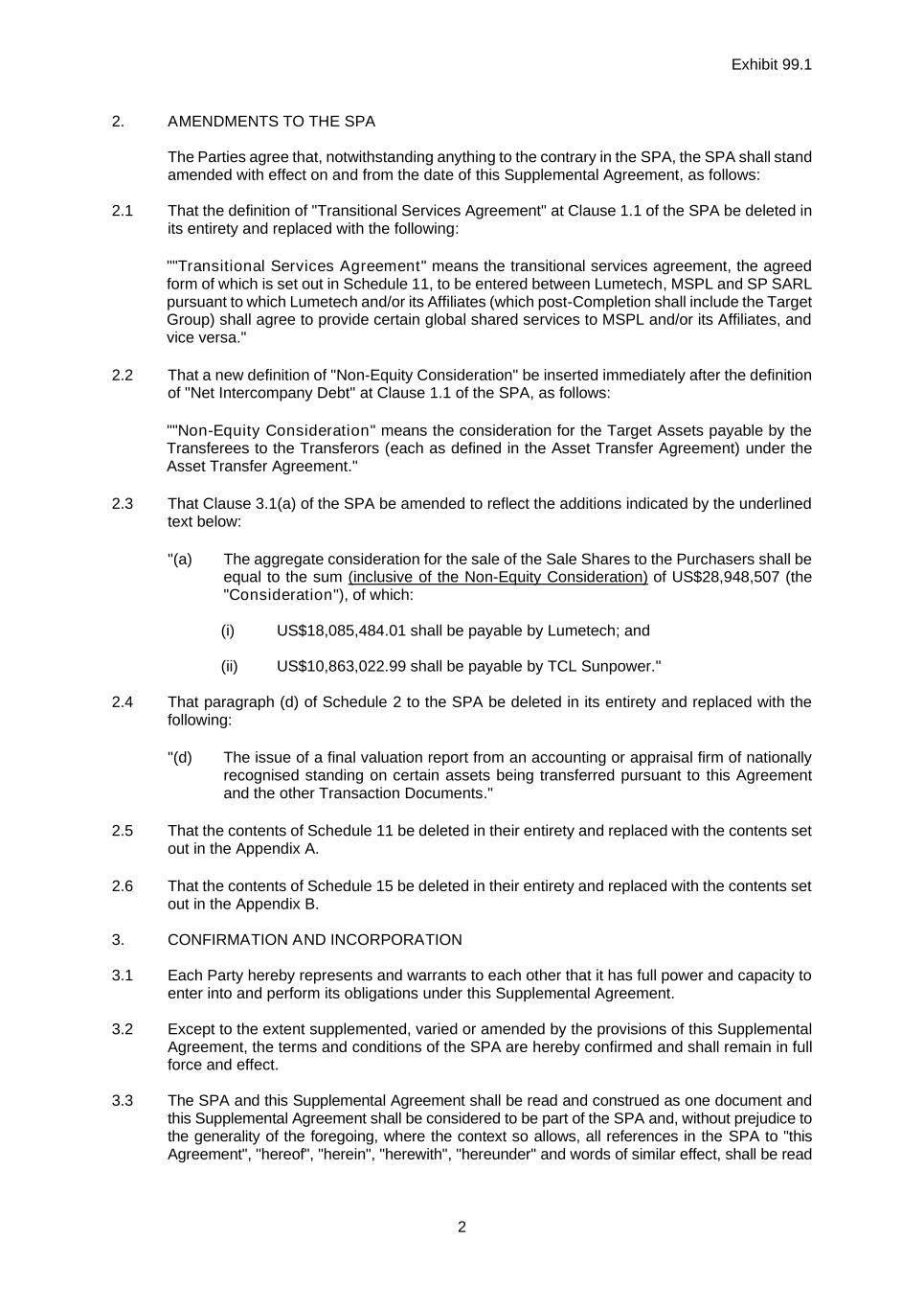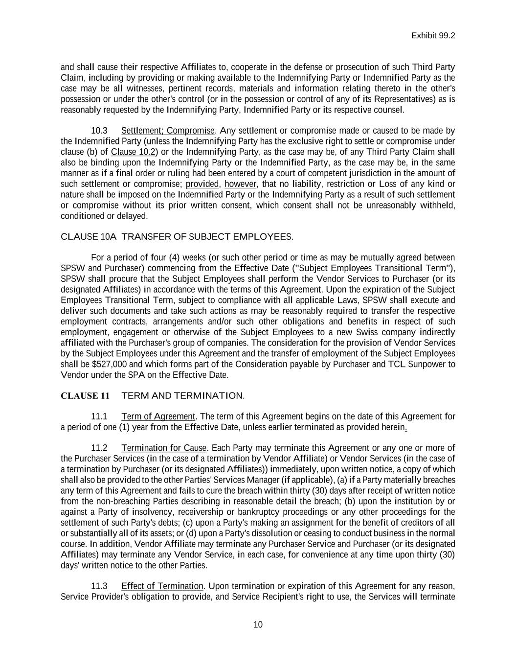 Exhibit 99.2 10 and shall cause their respective Affiliates to, cooperate in the defense or prosecution of such Third Party Claim, including by providing or making available to the Indemnifying Party or Indemnified Party as the case may be all witnesses, pertinent records, materials and information relating thereto in the other's possession or under the other's control (or in the possession or control of any of its Representatives) as is reasonably requested by the Indemnifying Party, Indemnified Party or its respective counsel. 10.3 Settlement; Compromise. Any settlement or compromise made or caused to be made by the Indemnified Party (unless the Indemnifying Party has the exclusive right to settle or compromise under clause (b) of Clause 10.2) or the Indemnifying Party, as the case may be, of any Third Party Claim shall also be binding upon the Indemnifying Party or the Indemnified Party, as the case may be, in the same manner as if a final order or ruling had been entered by a court of competent jurisdiction in the amount of such settlement or compromise; provided, however, that no liability, restriction or Loss of any kind or nature shall be imposed on the Indemnified Party or the Indemnifying Party as a result of such settlement or compromise without its prior written consent, which consent shall not be unreasonably withheld, conditioned or delayed. CLAUSE 10A TRANSFER OF SUBJECT EMPLOYEES. For a period of four (4) weeks (or such other period or time as may be mutually agreed between SPSW and Purchaser) commencing from the Effective Date ("Subject Employees Transitional Term"), SPSW shall procure that the Subject Employees shall perform the Vendor Services to Purchaser (or its designated Affiliates) in accordance with the terms of this Agreement. Upon the expiration of the Subject Employees Transitional Term, subject to compliance with all applicable Laws, SPSW shall execute and deliver such documents and take such actions as may be reasonably required to transfer the respective employment contracts, arrangements and/or such other obligations and benefits in respect of such employment, engagement or otherwise of the Subject Employees to a new Swiss company indirectly affiliated with the Purchaser's group of companies. The consideration for the provision of Vendor Services by the Subject Employees under this Agreement and the transfer of employment of the Subject Employees shall be $527,000 and which forms part of the Consideration payable by Purchaser and TCL Sunpower to Vendor under the SPA on the Effective Date. CLAUSE 11 TERM AND TERMINATION. 11.1 Term of Agreement. The term of this Agreement begins on the date of this Agreement for a period of one (1) year from the Effective Date, unless earlier terminated as provided herein. 11.2 Termination for Cause. Each Party may terminate this Agreement or any one or more of the Purchaser Services (in the case of a termination by Vendor Affiliate) or Vendor Services (in the case of a termination by Purchaser (or its designated Affiliates)) immediately, upon written notice, a copy of which shall also be provided to the other Parties' Services Manager (if applicable), (a) if a Party materially breaches any term of this Agreement and fails to cure the breach within thirty (30) days after receipt of written notice from the non-breaching Parties describing in reasonable detail the breach; (b) upon the institution by or against a Party of insolvency, receivership or bankruptcy proceedings or any other proceedings for the settlement of such Party's debts; (c) upon a Party's making an assignment for the benefit of creditors of all or substantially all of its assets; or (d) upon a Party's dissolution or ceasing to conduct business in the normal course. In addition, Vendor Affiliate may terminate any Purchaser Service and Purchaser (or its designated Affiliates) may terminate any Vendor Service, in each case, for convenience at any time upon thirty (30) days' written notice to the other Parties. 11.3 Effect of Termination. Upon termination or expiration of this Agreement for any reason, Service Provider's obligation to provide, and Service Recipient's right to use, the Services will terminate