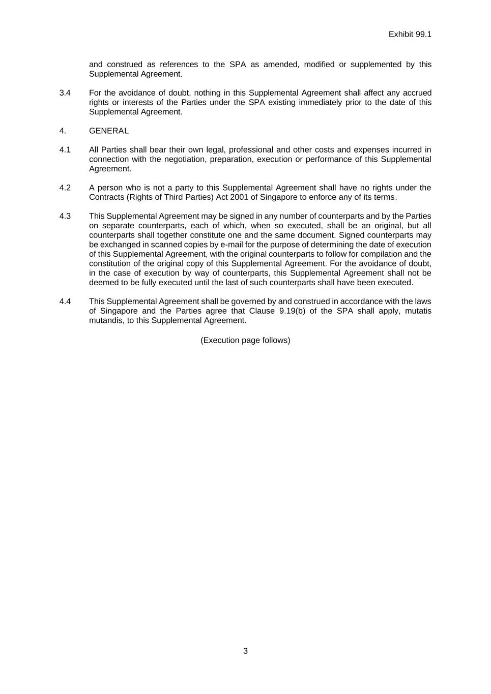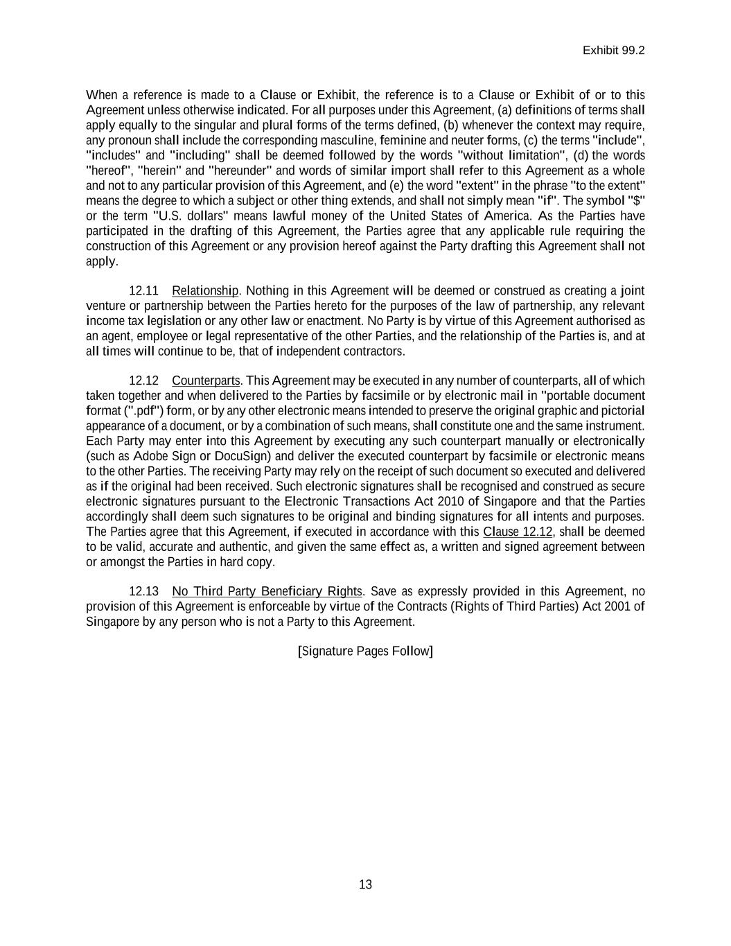 Exhibit 99.2 13 When a reference is made to a Clause or Exhibit, the reference is to a Clause or Exhibit of or to this Agreement unless otherwise indicated. For all purposes under this Agreement, (a) definitions of terms shall apply equally to the singular and plural forms of the terms defined, (b) whenever the context may require, any pronoun shall include the corresponding masculine, feminine and neuter forms, (c) the terms "include", "includes" and "including" shall be deemed followed by the words "without limitation", (d) the words "hereof", "herein" and "hereunder" and words of similar import shall refer to this Agreement as a whole and not to any particular provision of this Agreement, and (e) the word "extent" in the phrase "to the extent" means the degree to which a subject or other thing extends, and shall not simply mean "if". The symbol "$" or the term "U.S. dollars" means lawful money of the United States of America. As the Parties have participated in the drafting of this Agreement, the Parties agree that any applicable rule requiring the construction of this Agreement or any provision hereof against the Party drafting this Agreement shall not apply. 12.11 Relationship. Nothing in this Agreement will be deemed or construed as creating a joint venture or partnership between the Parties hereto for the purposes of the law of partnership, any relevant income tax legislation or any other law or enactment. No Party is by virtue of this Agreement authorised as an agent, employee or legal representative of the other Parties, and the relationship of the Parties is, and at all times will continue to be, that of independent contractors. 12.12 Counterparts. This Agreement may be executed in any number of counterparts, all of which taken together and when delivered to the Parties by facsimile or by electronic mail in "portable document format (".pdf") form, or by any other electronic means intended to preserve the original graphic and pictorial appearance of a document, or by a combination of such means, shall constitute one and the same instrument. Each Party may enter into this Agreement by executing any such counterpart manually or electronically (such as Adobe Sign or DocuSign) and deliver the executed counterpart by facsimile or electronic means to the other Parties. The receiving Party may rely on the receipt of such document so executed and delivered as if the original had been received. Such electronic signatures shall be recognised and construed as secure electronic signatures pursuant to the Electronic Transactions Act 2010 of Singapore and that the Parties accordingly shall deem such signatures to be original and binding signatures for all intents and purposes. The Parties agree that this Agreement, if executed in accordance with this Clause 12.12, shall be deemed to be valid, accurate and authentic, and given the same effect as, a written and signed agreement between or amongst the Parties in hard copy. 12.13 No Third Party Beneficiary Rights. Save as expressly provided in this Agreement, no provision of this Agreement is enforceable by virtue of the Contracts (Rights of Third Parties) Act 2001 of Singapore by any person who is not a Party to this Agreement. [Signature Pages Follow]