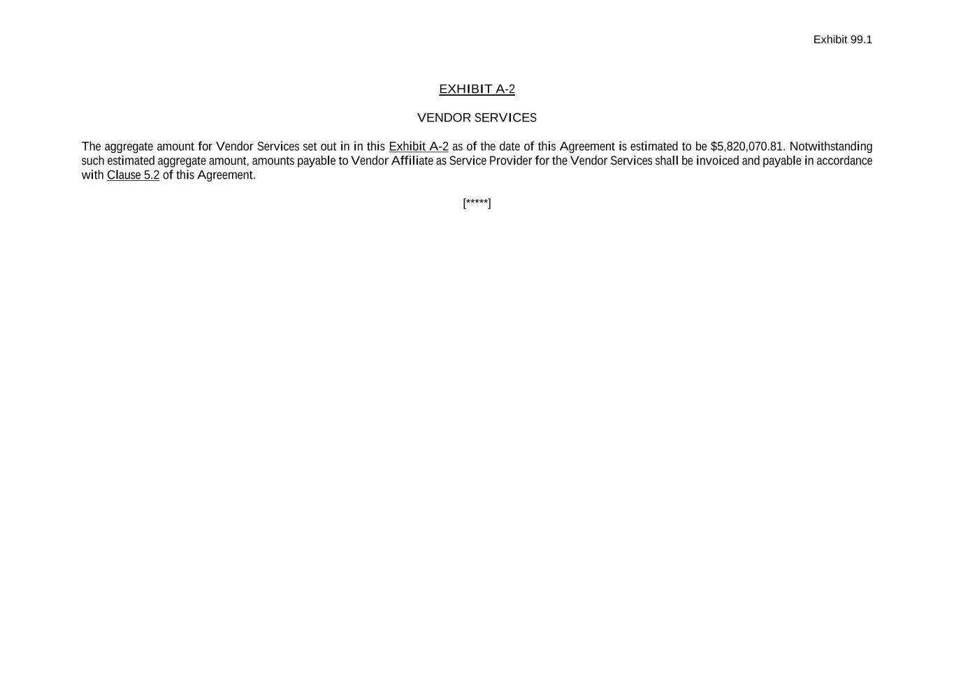 Exhibit 99.2 EXHIBIT A-2 VENDOR SERVICES The aggregate amount for Vendor Services set out in in this Exhibit A-2 as of the date of this Agreement is estimated to be $5,820,070.81. Notwithstanding such estimated aggregate amount, amounts payable to Vendor Affiliate as Service Provider for the Vendor Services shall be invoiced and payable in accordance with Clause 5.2 of this Agreement. [*****]