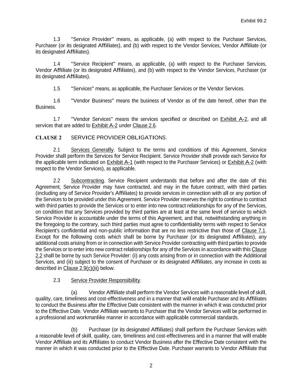 Exhibit 99.2 2 1.3 "Service Provider" means, as applicable, (a) with respect to the Purchaser Services, Purchaser (or its designated Affiliates), and (b) with respect to the Vendor Services, Vendor Affiliate (or its designated Affiliates). 1.4 "Service Recipient" means, as applicable, (a) with respect to the Purchaser Services, Vendor Affiliate (or its designated Affiliates), and (b) with respect to the Vendor Services, Purchaser (or its designated Affiliates). 1.5 "Services" means, as applicable, the Purchaser Services or the Vendor Services. 1.6 "Vendor Business" means the business of Vendor as of the date hereof, other than the Business. 1.7 "Vendor Services" means the services specified or described on Exhibit A-2, and all services that are added to Exhibit A-2 under Clause 2.6. CLAUSE 2 SERVICE PROVIDER OBLIGATIONS. 2.1 Services Generally. Subject to the terms and conditions of this Agreement, Service Provider shall perform the Services for Service Recipient. Service Provider shall provide each Service for the applicable term indicated on Exhibit A-1 (with respect to the Purchaser Services) or Exhibit A-2 (with respect to the Vendor Services), as applicable. 2.2 Subcontracting. Service Recipient understands that before and after the date of this Agreement, Service Provider may have contracted, and may in the future contract, with third parties (including any of Service Provider's Affiliates) to provide services in connection with all or any portion of the Services to be provided under this Agreement. Service Provider reserves the right to continue to contract with third parties to provide the Services or to enter into new contract relationships for any of the Services, on condition that any Services provided by third parties are at least at the same level of service to which Service Provider is accountable under the terms of this Agreement, and that, notwithstanding anything in the foregoing to the contrary, such third parties must agree to confidentiality terms with respect to Service Recipient's confidential and non-public information that are no less restrictive than those of Clause 7.1. Except for the following costs which shall be borne by Purchaser (or its designated Affiliates), any additional costs arising from or in connection with Service Provider contracting with third parties to provide the Services or to enter into new contract relationships for any of the Services in accordance with this Clause 2.2 shall be borne by such Service Provider: (i) any costs arising from or in connection with the Additional Services, and (ii) subject to the consent of Purchaser or its designated Affiliates, any increase in costs as described in Clause 2.9(c)(ii) below. 2.3 Service Provider Responsibility. (a) Vendor Affiliate shall perform the Vendor Services with a reasonable level of skill, quality, care, timeliness and cost-effectiveness and in a manner that will enable Purchaser and its Affiliates to conduct the Business after the Effective Date consistent with the manner in which it was conducted prior to the Effective Date. Vendor Affiliate warrants to Purchaser that the Vendor Services will be performed in a professional and workmanlike manner in accordance with applicable commercial standards. (b) Purchaser (or its designated Affiliates) shall perform the Purchaser Services with a reasonable level of skill, quality, care, timeliness and cost-effectiveness and in a manner that will enable Vendor Affiliate and its Affiliates to conduct Vendor Business after the Effective Date consistent with the manner in which it was conducted prior to the Effective Date. Purchaser warrants to Vendor Affiliate that