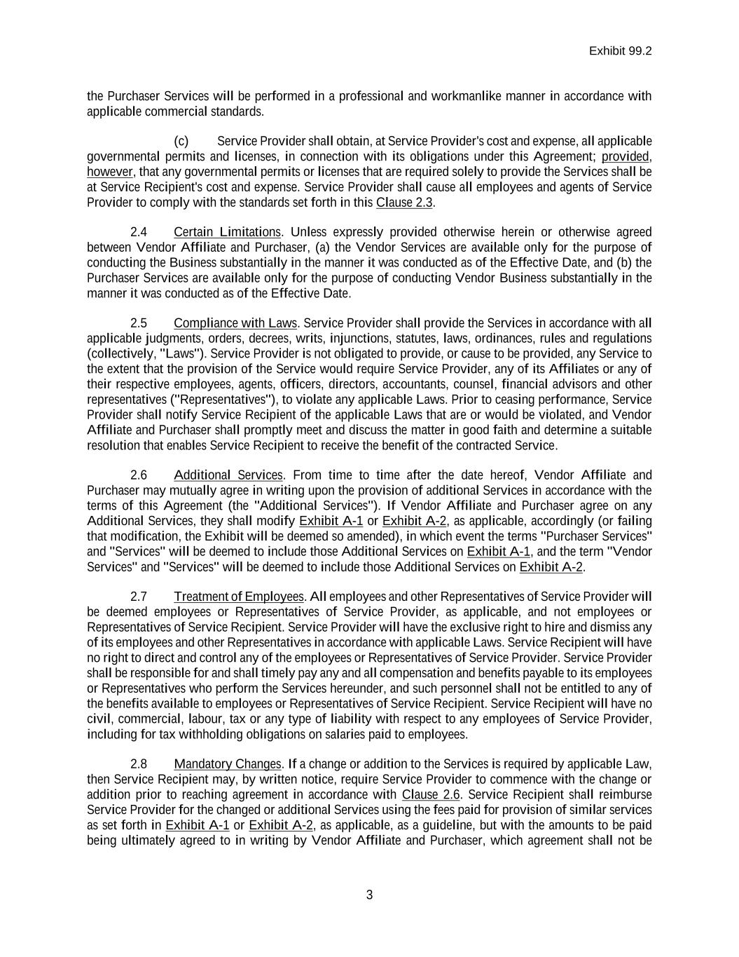 Exhibit 99.2 3 the Purchaser Services will be performed in a professional and workmanlike manner in accordance with applicable commercial standards. (c) Service Provider shall obtain, at Service Provider's cost and expense, all applicable governmental permits and licenses, in connection with its obligations under this Agreement; provided, however, that any governmental permits or licenses that are required solely to provide the Services shall be at Service Recipient's cost and expense. Service Provider shall cause all employees and agents of Service Provider to comply with the standards set forth in this Clause 2.3. 2.4 Certain Limitations. Unless expressly provided otherwise herein or otherwise agreed between Vendor Affiliate and Purchaser, (a) the Vendor Services are available only for the purpose of conducting the Business substantially in the manner it was conducted as of the Effective Date, and (b) the Purchaser Services are available only for the purpose of conducting Vendor Business substantially in the manner it was conducted as of the Effective Date. 2.5 Compliance with Laws. Service Provider shall provide the Services in accordance with all applicable judgments, orders, decrees, writs, injunctions, statutes, laws, ordinances, rules and regulations (collectively, "Laws"). Service Provider is not obligated to provide, or cause to be provided, any Service to the extent that the provision of the Service would require Service Provider, any of its Affiliates or any of their respective employees, agents, officers, directors, accountants, counsel, financial advisors and other representatives ("Representatives"), to violate any applicable Laws. Prior to ceasing performance, Service Provider shall notify Service Recipient of the applicable Laws that are or would be violated, and Vendor Affiliate and Purchaser shall promptly meet and discuss the matter in good faith and determine a suitable resolution that enables Service Recipient to receive the benefit of the contracted Service. 2.6 Additional Services. From time to time after the date hereof, Vendor Affiliate and Purchaser may mutually agree in writing upon the provision of additional Services in accordance with the terms of this Agreement (the "Additional Services"). If Vendor Affiliate and Purchaser agree on any Additional Services, they shall modify Exhibit A-1 or Exhibit A-2, as applicable, accordingly (or failing that modification, the Exhibit will be deemed so amended), in which event the terms "Purchaser Services" and "Services" will be deemed to include those Additional Services on Exhibit A-1, and the term "Vendor Services" and "Services" will be deemed to include those Additional Services on Exhibit A-2. 2.7 Treatment of Employees. All employees and other Representatives of Service Provider will be deemed employees or Representatives of Service Provider, as applicable, and not employees or Representatives of Service Recipient. Service Provider will have the exclusive right to hire and dismiss any of its employees and other Representatives in accordance with applicable Laws. Service Recipient will have no right to direct and control any of the employees or Representatives of Service Provider. Service Provider shall be responsible for and shall timely pay any and all compensation and benefits payable to its employees or Representatives who perform the Services hereunder, and such personnel shall not be entitled to any of the benefits available to employees or Representatives of Service Recipient. Service Recipient will have no civil, commercial, labour, tax or any type of liability with respect to any employees of Service Provider, including for tax withholding obligations on salaries paid to employees. 2.8 Mandatory Changes. If a change or addition to the Services is required by applicable Law, then Service Recipient may, by written notice, require Service Provider to commence with the change or addition prior to reaching agreement in accordance with Clause 2.6. Service Recipient shall reimburse Service Provider for the changed or additional Services using the fees paid for provision of similar services as set forth in Exhibit A-1 or Exhibit A-2, as applicable, as a guideline, but with the amounts to be paid being ultimately agreed to in writing by Vendor Affiliate and Purchaser, which agreement shall not be