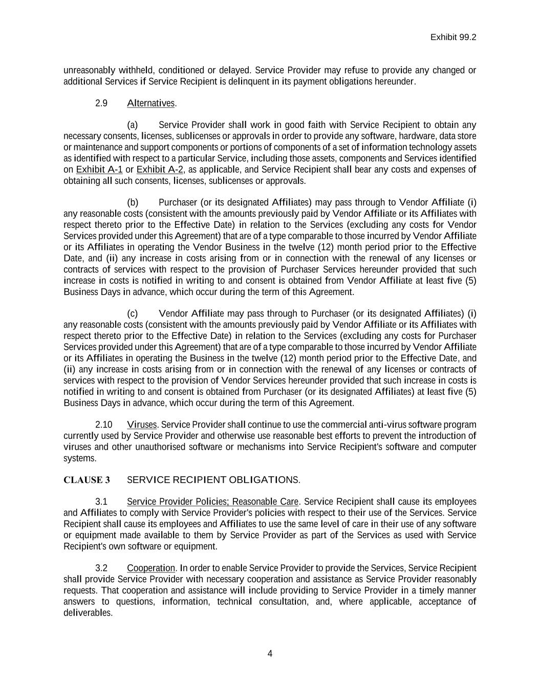 Exhibit 99.2 4 unreasonably withheld, conditioned or delayed. Service Provider may refuse to provide any changed or additional Services if Service Recipient is delinquent in its payment obligations hereunder. 2.9 Alternatives. (a) Service Provider shall work in good faith with Service Recipient to obtain any necessary consents, licenses, sublicenses or approvals in order to provide any software, hardware, data store or maintenance and support components or portions of components of a set of information technology assets as identified with respect to a particular Service, including those assets, components and Services identified on Exhibit A-1 or Exhibit A-2, as applicable, and Service Recipient shall bear any costs and expenses of obtaining all such consents, licenses, sublicenses or approvals. (b) Purchaser (or its designated Affiliates) may pass through to Vendor Affiliate (i) any reasonable costs (consistent with the amounts previously paid by Vendor Affiliate or its Affiliates with respect thereto prior to the Effective Date) in relation to the Services (excluding any costs for Vendor Services provided under this Agreement) that are of a type comparable to those incurred by Vendor Affiliate or its Affiliates in operating the Vendor Business in the twelve (12) month period prior to the Effective Date, and (ii) any increase in costs arising from or in connection with the renewal of any licenses or contracts of services with respect to the provision of Purchaser Services hereunder provided that such increase in costs is notified in writing to and consent is obtained from Vendor Affiliate at least five (5) Business Days in advance, which occur during the term of this Agreement. (c) Vendor Affiliate may pass through to Purchaser (or its designated Affiliates) (i) any reasonable costs (consistent with the amounts previously paid by Vendor Affiliate or its Affiliates with respect thereto prior to the Effective Date) in relation to the Services (excluding any costs for Purchaser Services provided under this Agreement) that are of a type comparable to those incurred by Vendor Affiliate or its Affiliates in operating the Business in the twelve (12) month period prior to the Effective Date, and (ii) any increase in costs arising from or in connection with the renewal of any licenses or contracts of services with respect to the provision of Vendor Services hereunder provided that such increase in costs is notified in writing to and consent is obtained from Purchaser (or its designated Affiliates) at least five (5) Business Days in advance, which occur during the term of this Agreement. 2.10 Viruses. Service Provider shall continue to use the commercial anti-virus software program currently used by Service Provider and otherwise use reasonable best efforts to prevent the introduction of viruses and other unauthorised software or mechanisms into Service Recipient's software and computer systems. CLAUSE 3 SERVICE RECIPIENT OBLIGATIONS. 3.1 Service Provider Policies; Reasonable Care. Service Recipient shall cause its employees and Affiliates to comply with Service Provider's policies with respect to their use of the Services. Service Recipient shall cause its employees and Affiliates to use the same level of care in their use of any software or equipment made available to them by Service Provider as part of the Services as used with Service Recipient's own software or equipment. 3.2 Cooperation. In order to enable Service Provider to provide the Services, Service Recipient shall provide Service Provider with necessary cooperation and assistance as Service Provider reasonably requests. That cooperation and assistance will include providing to Service Provider in a timely manner answers to questions, information, technical consultation, and, where applicable, acceptance of deliverables.