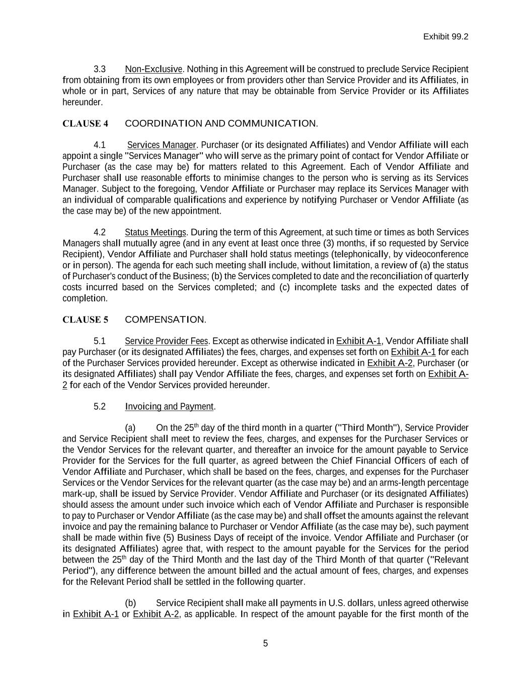 Exhibit 99.2 5 3.3 Non-Exclusive. Nothing in this Agreement will be construed to preclude Service Recipient from obtaining from its own employees or from providers other than Service Provider and its Affiliates, in whole or in part, Services of any nature that may be obtainable from Service Provider or its Affiliates hereunder. CLAUSE 4 COORDINATION AND COMMUNICATION. 4.1 Services Manager. Purchaser (or its designated Affiliates) and Vendor Affiliate will each appoint a single "Services Manager" who will serve as the primary point of contact for Vendor Affiliate or Purchaser (as the case may be) for matters related to this Agreement. Each of Vendor Affiliate and Purchaser shall use reasonable efforts to minimise changes to the person who is serving as its Services Manager. Subject to the foregoing, Vendor Affiliate or Purchaser may replace its Services Manager with an individual of comparable qualifications and experience by notifying Purchaser or Vendor Affiliate (as the case may be) of the new appointment. 4.2 Status Meetings. During the term of this Agreement, at such time or times as both Services Managers shall mutually agree (and in any event at least once three (3) months, if so requested by Service Recipient), Vendor Affiliate and Purchaser shall hold status meetings (telephonically, by videoconference or in person). The agenda for each such meeting shall include, without limitation, a review of (a) the status of Purchaser's conduct of the Business; (b) the Services completed to date and the reconciliation of quarterly costs incurred based on the Services completed; and (c) incomplete tasks and the expected dates of completion. CLAUSE 5 COMPENSATION. 5.1 Service Provider Fees. Except as otherwise indicated in Exhibit A-1, Vendor Affiliate shall pay Purchaser (or its designated Affiliates) the fees, charges, and expenses set forth on Exhibit A-1 for each of the Purchaser Services provided hereunder. Except as otherwise indicated in Exhibit A-2, Purchaser (or its designated Affiliates) shall pay Vendor Affiliate the fees, charges, and expenses set forth on Exhibit A- 2 for each of the Vendor Services provided hereunder. 5.2 Invoicing and Payment. (a) On the 25th day of the third month in a quarter ("Third Month"), Service Provider and Service Recipient shall meet to review the fees, charges, and expenses for the Purchaser Services or the Vendor Services for the relevant quarter, and thereafter an invoice for the amount payable to Service Provider for the Services for the full quarter, as agreed between the Chief Financial Officers of each of Vendor Affiliate and Purchaser, which shall be based on the fees, charges, and expenses for the Purchaser Services or the Vendor Services for the relevant quarter (as the case may be) and an arms-length percentage mark-up, shall be issued by Service Provider. Vendor Affiliate and Purchaser (or its designated Affiliates) should assess the amount under such invoice which each of Vendor Affiliate and Purchaser is responsible to pay to Purchaser or Vendor Affiliate (as the case may be) and shall offset the amounts against the relevant invoice and pay the remaining balance to Purchaser or Vendor Affiliate (as the case may be), such payment shall be made within five (5) Business Days of receipt of the invoice. Vendor Affiliate and Purchaser (or its designated Affiliates) agree that, with respect to the amount payable for the Services for the period between the 25th day of the Third Month and the last day of the Third Month of that quarter ("Relevant Period"), any difference between the amount billed and the actual amount of fees, charges, and expenses for the Relevant Period shall be settled in the following quarter. (b) Service Recipient shall make all payments in U.S. dollars, unless agreed otherwise in Exhibit A-1 or Exhibit A-2, as applicable. In respect of the amount payable for the first month of the