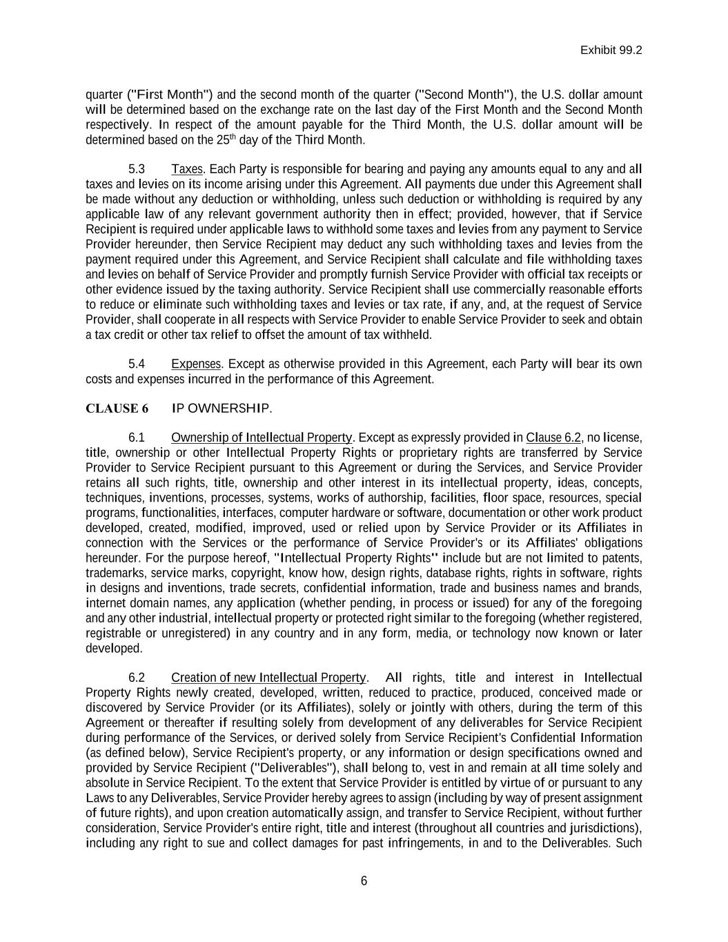 Exhibit 99.2 6 quarter ("First Month") and the second month of the quarter ("Second Month"), the U.S. dollar amount will be determined based on the exchange rate on the last day of the First Month and the Second Month respectively. In respect of the amount payable for the Third Month, the U.S. dollar amount will be determined based on the 25th day of the Third Month. 5.3 Taxes. Each Party is responsible for bearing and paying any amounts equal to any and all taxes and levies on its income arising under this Agreement. All payments due under this Agreement shall be made without any deduction or withholding, unless such deduction or withholding is required by any applicable law of any relevant government authority then in effect; provided, however, that if Service Recipient is required under applicable laws to withhold some taxes and levies from any payment to Service Provider hereunder, then Service Recipient may deduct any such withholding taxes and levies from the payment required under this Agreement, and Service Recipient shall calculate and file withholding taxes and levies on behalf of Service Provider and promptly furnish Service Provider with official tax receipts or other evidence issued by the taxing authority. Service Recipient shall use commercially reasonable efforts to reduce or eliminate such withholding taxes and levies or tax rate, if any, and, at the request of Service Provider, shall cooperate in all respects with Service Provider to enable Service Provider to seek and obtain a tax credit or other tax relief to offset the amount of tax withheld. 5.4 Expenses. Except as otherwise provided in this Agreement, each Party will bear its own costs and expenses incurred in the performance of this Agreement. CLAUSE 6 IP OWNERSHIP. 6.1 Ownership of Intellectual Property. Except as expressly provided in Clause 6.2, no license, title, ownership or other Intellectual Property Rights or proprietary rights are transferred by Service Provider to Service Recipient pursuant to this Agreement or during the Services, and Service Provider retains all such rights, title, ownership and other interest in its intellectual property, ideas, concepts, techniques, inventions, processes, systems, works of authorship, facilities, floor space, resources, special programs, functionalities, interfaces, computer hardware or software, documentation or other work product developed, created, modified, improved, used or relied upon by Service Provider or its Affiliates in connection with the Services or the performance of Service Provider's or its Affiliates' obligations hereunder. For the purpose hereof, "Intellectual Property Rights" include but are not limited to patents, trademarks, service marks, copyright, know how, design rights, database rights, rights in software, rights in designs and inventions, trade secrets, confidential information, trade and business names and brands, internet domain names, any application (whether pending, in process or issued) for any of the foregoing and any other industrial, intellectual property or protected right similar to the foregoing (whether registered, registrable or unregistered) in any country and in any form, media, or technology now known or later developed. 6.2 Creation of new Intellectual Property. All rights, title and interest in Intellectual Property Rights newly created, developed, written, reduced to practice, produced, conceived made or discovered by Service Provider (or its Affiliates), solely or jointly with others, during the term of this Agreement or thereafter if resulting solely from development of any deliverables for Service Recipient during performance of the Services, or derived solely from Service Recipient's Confidential Information (as defined below), Service Recipient's property, or any information or design specifications owned and provided by Service Recipient ("Deliverables"), shall belong to, vest in and remain at all time solely and absolute in Service Recipient. To the extent that Service Provider is entitled by virtue of or pursuant to any Laws to any Deliverables, Service Provider hereby agrees to assign (including by way of present assignment of future rights), and upon creation automatically assign, and transfer to Service Recipient, without further consideration, Service Provider's entire right, title and interest (throughout all countries and jurisdictions), including any right to sue and collect damages for past infringements, in and to the Deliverables. Such