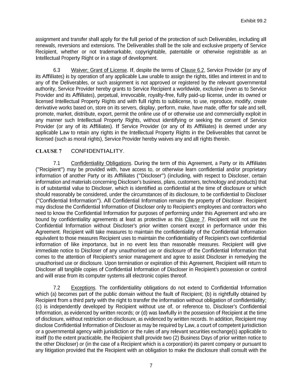 Exhibit 99.2 7 assignment and transfer shall apply for the full period of the protection of such Deliverables, including all renewals, reversions and extensions. The Deliverables shall be the sole and exclusive property of Service Recipient, whether or not trademarkable, copyrightable, patentable or otherwise registrable as an Intellectual Property Right or in a stage of development. 6.3 Waiver; Grant of License. If, despite the terms of Clause 6.2, Service Provider (or any of its Affiliates) is by operation of any applicable Law unable to assign the rights, titles and interest in and to any of the Deliverables, or such assignment is not approved or registered by the relevant governmental authority, Service Provider hereby grants to Service Recipient a worldwide, exclusive (even as to Service Provider and its Affiliates), perpetual, irrevocable, royalty-free, fully paid-up license, under its owned or licensed Intellectual Property Rights and with full rights to sublicense, to use, reproduce, modify, create derivative works based on, store on its servers, display, perform, make, have made, offer for sale and sell, promote, market, distribute, export, permit the online use of or otherwise use and commercially exploit in any manner such Intellectual Property Rights, without identifying or seeking the consent of Service Provider (or any of its Affiliates). If Service Provider (or any of its Affiliates) is deemed under any applicable Law to retain any rights in the Intellectual Property Rights in the Deliverables that cannot be licensed (such as moral rights), Service Provider hereby waives any and all rights therein. CLAUSE 7 CONFIDENTIALITY. 7.1 Confidentiality Obligations. During the term of this Agreement, a Party or its Affiliates ("Recipient") may be provided with, have access to, or otherwise learn confidential and/or proprietary information of another Party or its Affiliates ("Discloser") (including, with respect to Discloser, certain information and materials concerning Discloser's business, plans, customers, technology and products) that is of substantial value to Discloser, which is identified as confidential at the time of disclosure or which should reasonably be considered, under the circumstances of its disclosure, to be confidential to Discloser ("Confidential Information"). All Confidential Information remains the property of Discloser. Recipient may disclose the Confidential Information of Discloser only to Recipient's employees and contractors who need to know the Confidential Information for purposes of performing under this Agreement and who are bound by confidentiality agreements at least as protective as this Clause 7. Recipient will not use the Confidential Information without Discloser's prior written consent except in performance under this Agreement. Recipient will take measures to maintain the confidentiality of the Confidential Information equivalent to those measures Recipient uses to maintain the confidentiality of Recipient's own confidential information of like importance, but in no event less than reasonable measures. Recipient will give immediate notice to Discloser of any unauthorised use or disclosure of the Confidential Information that comes to the attention of Recipient's senior management and agree to assist Discloser in remedying the unauthorised use or disclosure. Upon termination or expiration of this Agreement, Recipient will return to Discloser all tangible copies of Confidential Information of Discloser in Recipient's possession or control and will erase from its computer systems all electronic copies thereof. 7.2 Exceptions. The confidentiality obligations do not extend to Confidential Information which (a) becomes part of the public domain without the fault of Recipient; (b) is rightfully obtained by Recipient from a third party with the right to transfer the information without obligation of confidentiality; (c) is independently developed by Recipient without use of, or reference to, Discloser's Confidential Information, as evidenced by written records; or (d) was lawfully in the possession of Recipient at the time of disclosure, without restriction on disclosure, as evidenced by written records. In addition, Recipient may disclose Confidential Information of Discloser as may be required by Law, a court of competent jurisdiction or a governmental agency with jurisdiction or the rules of any relevant securities exchange(s) applicable to itself (to the extent practicable, the Recipient shall provide two (2) Business Days of prior written notice to the other Discloser) or (in the case of a Recipient which is a corporation) its parent company or pursuant to any litigation provided that the Recipient with an obligation to make the disclosure shall consult with the