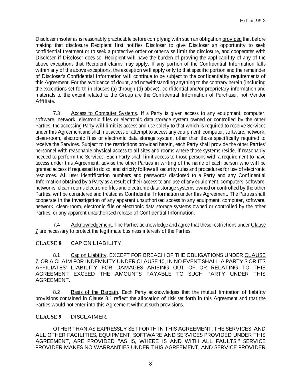 Exhibit 99.2 8 Discloser insofar as is reasonably practicable before complying with such an obligation provided that before making that disclosure Recipient first notifies Discloser to give Discloser an opportunity to seek confidential treatment or to seek a protective order or otherwise limit the disclosure, and cooperates with Discloser if Discloser does so. Recipient will have the burden of proving the applicability of any of the above exceptions that Recipient claims may apply. If any portion of the Confidential Information falls within any of the above exceptions, the exception will apply only to that specific portion and the remainder of Discloser's Confidential Information will continue to be subject to the confidentiality requirements of this Agreement. For the avoidance of doubt, and notwithstanding anything to the contrary herein (including the exceptions set forth in clauses (a) through (d) above), confidential and/or proprietary information and materials to the extent related to the Group are the Confidential Information of Purchaser, not Vendor Affiliate. 7.3 Access to Computer Systems. If a Party is given access to any equipment, computer, software, network, electronic files or electronic data storage system owned or controlled by the other Parties, the accessing Party will limit its access and use solely to that which is required to receive Services under this Agreement and shall not access or attempt to access any equipment, computer, software, network, clean-room, electronic files or electronic data storage system, other than those specifically required to receive the Services. Subject to the restrictions provided herein, each Party shall provide the other Parties' personnel with reasonable physical access to all sites and rooms where those systems reside, if reasonably needed to perform the Services. Each Party shall limit access to those persons with a requirement to have access under this Agreement, advise the other Parties in writing of the name of each person who will be granted access if requested to do so, and strictly follow all security rules and procedures for use of electronic resources. All user identification numbers and passwords disclosed to a Party and any Confidential Information obtained by a Party as a result of their access to and use of any equipment, computers, software, networks, clean-rooms electronic files and electronic data storage systems owned or controlled by the other Parties, will be considered and treated as Confidential Information under this Agreement. The Parties shall cooperate in the investigation of any apparent unauthorised access to any equipment, computer, software, network, clean-room, electronic file or electronic data storage systems owned or controlled by the other Parties, or any apparent unauthorised release of Confidential Information. 7.4 Acknowledgement. The Parties acknowledge and agree that these restrictions under Clause 7 are necessary to protect the legitimate business interests of the Parties. CLAUSE 8 CAP ON LIABILITY. 8.1 Cap on Liability. EXCEPT FOR BREACH OF THE OBLIGATIONS UNDER CLAUSE 7, OR A CLAIM FOR INDEMNITY UNDER CLAUSE 10, IN NO EVENT SHALL A PARTY'S OR ITS AFFILIATES' LIABILITY FOR DAMAGES ARISING OUT OF OR RELATING TO THIS AGREEMENT EXCEED THE AMOUNTS PAYABLE TO SUCH PARTY UNDER THIS AGREEMENT. 8.2 Basis of the Bargain. Each Party acknowledges that the mutual limitation of liability provisions contained in Clause 8.1 reflect the allocation of risk set forth in this Agreement and that the Parties would not enter into this Agreement without such provisions. CLAUSE 9 DISCLAIMER. OTHER THAN AS EXPRESSLY SET FORTH IN THIS AGREEMENT, THE SERVICES, AND ALL OTHER FACILITIES, EQUIPMENT, SOFTWARE AND SERVICES PROVIDED UNDER THIS AGREEMENT, ARE PROVIDED "AS IS, WHERE IS AND WITH ALL FAULTS." SERVICE PROVIDER MAKES NO WARRANTIES UNDER THIS AGREEMENT, AND SERVICE PROVIDER