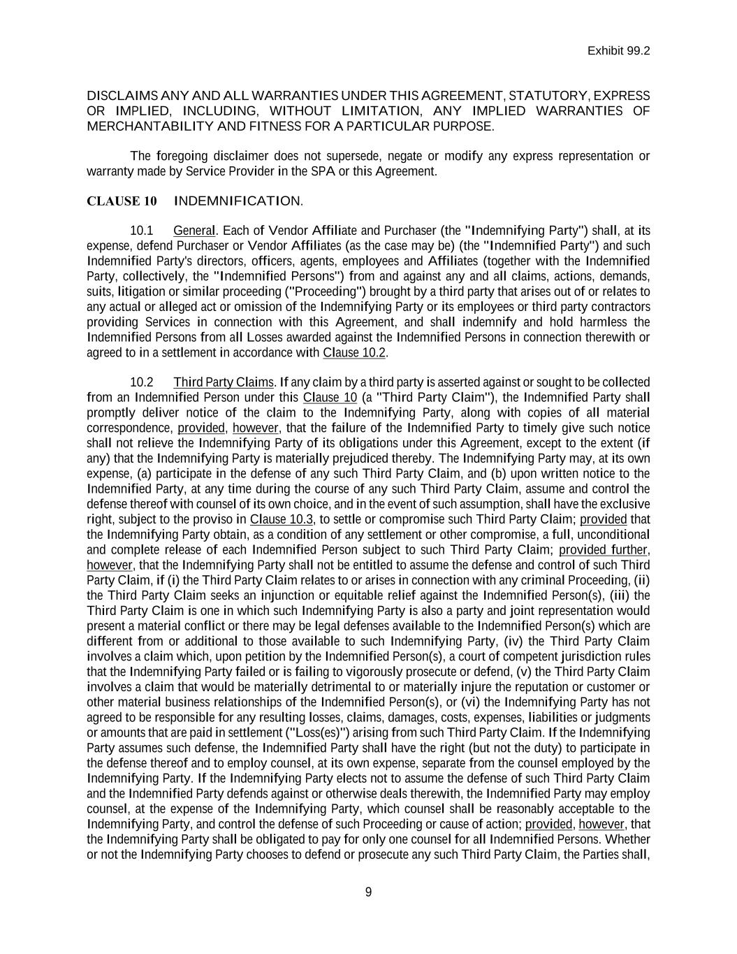 Exhibit 99.2 9 DISCLAIMS ANY AND ALL WARRANTIES UNDER THIS AGREEMENT, STATUTORY, EXPRESS OR IMPLIED, INCLUDING, WITHOUT LIMITATION, ANY IMPLIED WARRANTIES OF MERCHANTABILITY AND FITNESS FOR A PARTICULAR PURPOSE. The foregoing disclaimer does not supersede, negate or modify any express representation or warranty made by Service Provider in the SPA or this Agreement. CLAUSE 10 INDEMNIFICATION. 10.1 General. Each of Vendor Affiliate and Purchaser (the "Indemnifying Party") shall, at its expense, defend Purchaser or Vendor Affiliates (as the case may be) (the "Indemnified Party") and such Indemnified Party's directors, officers, agents, employees and Affiliates (together with the Indemnified Party, collectively, the "Indemnified Persons") from and against any and all claims, actions, demands, suits, litigation or similar proceeding ("Proceeding") brought by a third party that arises out of or relates to any actual or alleged act or omission of the Indemnifying Party or its employees or third party contractors providing Services in connection with this Agreement, and shall indemnify and hold harmless the Indemnified Persons from all Losses awarded against the Indemnified Persons in connection therewith or agreed to in a settlement in accordance with Clause 10.2. 10.2 Third Party Claims. If any claim by a third party is asserted against or sought to be collected from an Indemnified Person under this Clause 10 (a "Third Party Claim"), the Indemnified Party shall promptly deliver notice of the claim to the Indemnifying Party, along with copies of all material correspondence, provided, however, that the failure of the Indemnified Party to timely give such notice shall not relieve the Indemnifying Party of its obligations under this Agreement, except to the extent (if any) that the Indemnifying Party is materially prejudiced thereby. The Indemnifying Party may, at its own expense, (a) participate in the defense of any such Third Party Claim, and (b) upon written notice to the Indemnified Party, at any time during the course of any such Third Party Claim, assume and control the defense thereof with counsel of its own choice, and in the event of such assumption, shall have the exclusive right, subject to the proviso in Clause 10.3, to settle or compromise such Third Party Claim; provided that the Indemnifying Party obtain, as a condition of any settlement or other compromise, a full, unconditional and complete release of each Indemnified Person subject to such Third Party Claim; provided further, however, that the Indemnifying Party shall not be entitled to assume the defense and control of such Third Party Claim, if (i) the Third Party Claim relates to or arises in connection with any criminal Proceeding, (ii) the Third Party Claim seeks an injunction or equitable relief against the Indemnified Person(s), (iii) the Third Party Claim is one in which such Indemnifying Party is also a party and joint representation would present a material conflict or there may be legal defenses available to the Indemnified Person(s) which are different from or additional to those available to such Indemnifying Party, (iv) the Third Party Claim involves a claim which, upon petition by the Indemnified Person(s), a court of competent jurisdiction rules that the Indemnifying Party failed or is failing to vigorously prosecute or defend, (v) the Third Party Claim involves a claim that would be materially detrimental to or materially injure the reputation or customer or other material business relationships of the Indemnified Person(s), or (vi) the Indemnifying Party has not agreed to be responsible for any resulting losses, claims, damages, costs, expenses, liabilities or judgments or amounts that are paid in settlement ("Loss(es)") arising from such Third Party Claim. If the Indemnifying Party assumes such defense, the Indemnified Party shall have the right (but not the duty) to participate in the defense thereof and to employ counsel, at its own expense, separate from the counsel employed by the Indemnifying Party. If the Indemnifying Party elects not to assume the defense of such Third Party Claim and the Indemnified Party defends against or otherwise deals therewith, the Indemnified Party may employ counsel, at the expense of the Indemnifying Party, which counsel shall be reasonably acceptable to the Indemnifying Party, and control the defense of such Proceeding or cause of action; provided, however, that the Indemnifying Party shall be obligated to pay for only one counsel for all Indemnified Persons. Whether or not the Indemnifying Party chooses to defend or prosecute any such Third Party Claim, the Parties shall,