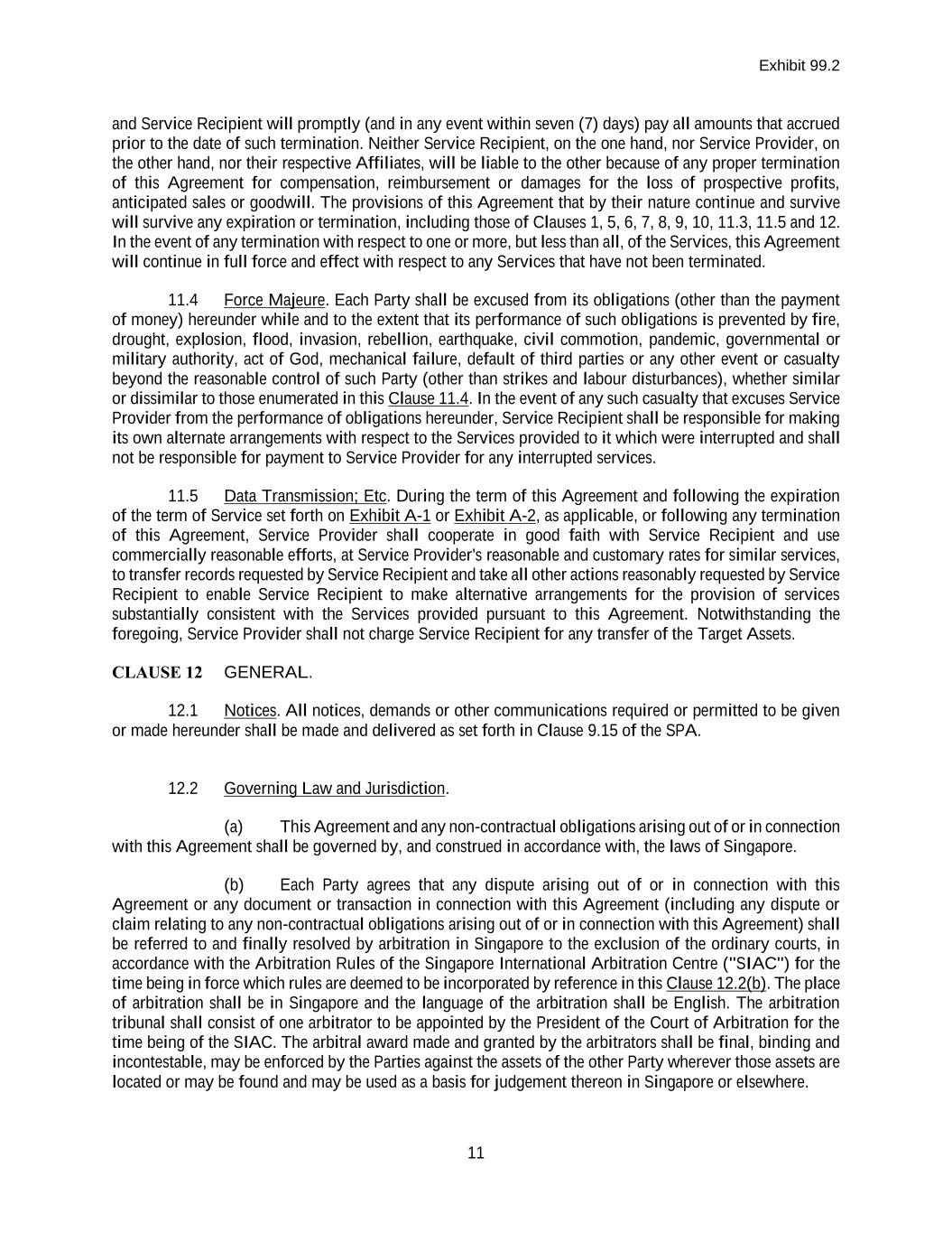 Exhibit 99.2 11 and Service Recipient will promptly (and in any event within seven (7) days) pay all amounts that accrued prior to the date of such termination. Neither Service Recipient, on the one hand, nor Service Provider, on the other hand, nor their respective Affiliates, will be liable to the other because of any proper termination of this Agreement for compensation, reimbursement or damages for the loss of prospective profits, anticipated sales or goodwill. The provisions of this Agreement that by their nature continue and survive will survive any expiration or termination, including those of Clauses 1, 5, 6, 7, 8, 9, 10, 11.3, 11.5 and 12. In the event of any termination with respect to one or more, but less than all, of the Services, this Agreement will continue in full force and effect with respect to any Services that have not been terminated. 11.4 Force Majeure. Each Party shall be excused from its obligations (other than the payment of money) hereunder while and to the extent that its performance of such obligations is prevented by fire, drought, explosion, flood, invasion, rebellion, earthquake, civil commotion, pandemic, governmental or military authority, act of God, mechanical failure, default of third parties or any other event or casualty beyond the reasonable control of such Party (other than strikes and labour disturbances), whether similar or dissimilar to those enumerated in this Clause 11.4. In the event of any such casualty that excuses Service Provider from the performance of obligations hereunder, Service Recipient shall be responsible for making its own alternate arrangements with respect to the Services provided to it which were interrupted and shall not be responsible for payment to Service Provider for any interrupted services. 11.5 Data Transmission; Etc. During the term of this Agreement and following the expiration of the term of Service set forth on Exhibit A-1 or Exhibit A-2, as applicable, or following any termination of this Agreement, Service Provider shall cooperate in good faith with Service Recipient and use commercially reasonable efforts, at Service Provider's reasonable and customary rates for similar services, to transfer records requested by Service Recipient and take all other actions reasonably requested by Service Recipient to enable Service Recipient to make alternative arrangements for the provision of services substantially consistent with the Services provided pursuant to this Agreement. Notwithstanding the foregoing, Service Provider shall not charge Service Recipient for any transfer of the Target Assets. CLAUSE 12 GENERAL. 12.1 Notices. All notices, demands or other communications required or permitted to be given or made hereunder shall be made and delivered as set forth in Clause 9.15 of the SPA. 12.2 Governing Law and Jurisdiction. (a) This Agreement and any non-contractual obligations arising out of or in connection with this Agreement shall be governed by, and construed in accordance with, the laws of Singapore. (b) Each Party agrees that any dispute arising out of or in connection with this Agreement or any document or transaction in connection with this Agreement (including any dispute or claim relating to any non-contractual obligations arising out of or in connection with this Agreement) shall be referred to and finally resolved by arbitration in Singapore to the exclusion of the ordinary courts, in accordance with the Arbitration Rules of the Singapore International Arbitration Centre ("SIAC") for the time being in force which rules are deemed to be incorporated by reference in this Clause 12.2(b). The place of arbitration shall be in Singapore and the language of the arbitration shall be English. The arbitration tribunal shall consist of one arbitrator to be appointed by the President of the Court of Arbitration for the time being of the SIAC. The arbitral award made and granted by the arbitrators shall be final, binding and incontestable, may be enforced by the Parties against the assets of the other Party wherever those assets are located or may be found and may be used as a basis for judgement thereon in Singapore or elsewhere.