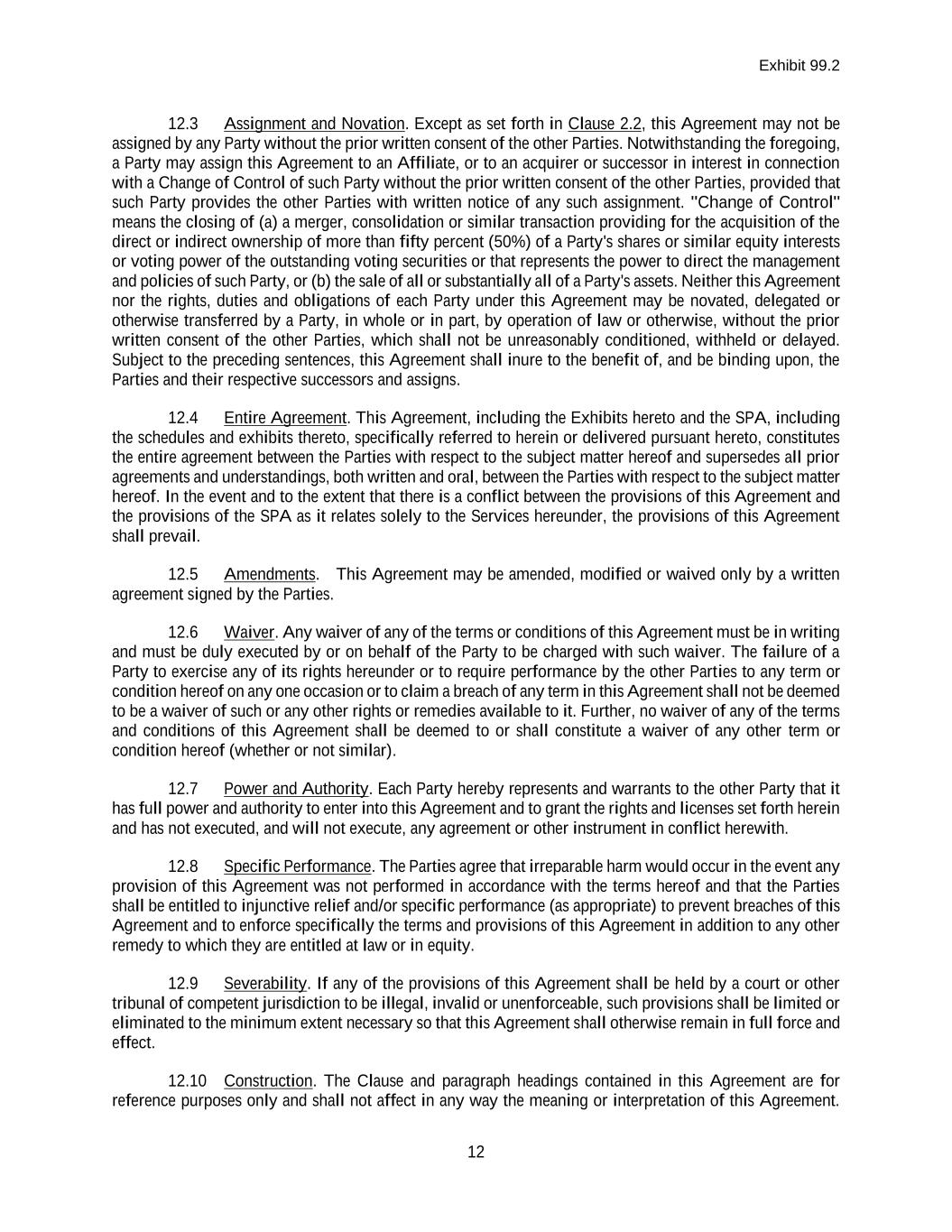 Exhibit 99.2 12 12.3 Assignment and Novation. Except as set forth in Clause 2.2, this Agreement may not be assigned by any Party without the prior written consent of the other Parties. Notwithstanding the foregoing, a Party may assign this Agreement to an Affiliate, or to an acquirer or successor in interest in connection with a Change of Control of such Party without the prior written consent of the other Parties, provided that such Party provides the other Parties with written notice of any such assignment. "Change of Control" means the closing of (a) a merger, consolidation or similar transaction providing for the acquisition of the direct or indirect ownership of more than fifty percent (50%) of a Party's shares or similar equity interests or voting power of the outstanding voting securities or that represents the power to direct the management and policies of such Party, or (b) the sale of all or substantially all of a Party's assets. Neither this Agreement nor the rights, duties and obligations of each Party under this Agreement may be novated, delegated or otherwise transferred by a Party, in whole or in part, by operation of law or otherwise, without the prior written consent of the other Parties, which shall not be unreasonably conditioned, withheld or delayed. Subject to the preceding sentences, this Agreement shall inure to the benefit of, and be binding upon, the Parties and their respective successors and assigns. 12.4 Entire Agreement. This Agreement, including the Exhibits hereto and the SPA, including the schedules and exhibits thereto, specifically referred to herein or delivered pursuant hereto, constitutes the entire agreement between the Parties with respect to the subject matter hereof and supersedes all prior agreements and understandings, both written and oral, between the Parties with respect to the subject matter hereof. In the event and to the extent that there is a conflict between the provisions of this Agreement and the provisions of the SPA as it relates solely to the Services hereunder, the provisions of this Agreement shall prevail. 12.5 Amendments. This Agreement may be amended, modified or waived only by a written agreement signed by the Parties. 12.6 Waiver. Any waiver of any of the terms or conditions of this Agreement must be in writing and must be duly executed by or on behalf of the Party to be charged with such waiver. The failure of a Party to exercise any of its rights hereunder or to require performance by the other Parties to any term or condition hereof on any one occasion or to claim a breach of any term in this Agreement shall not be deemed to be a waiver of such or any other rights or remedies available to it. Further, no waiver of any of the terms and conditions of this Agreement shall be deemed to or shall constitute a waiver of any other term or condition hereof (whether or not similar). 12.7 Power and Authority. Each Party hereby represents and warrants to the other Party that it has full power and authority to enter into this Agreement and to grant the rights and licenses set forth herein and has not executed, and will not execute, any agreement or other instrument in conflict herewith. 12.8 Specific Performance. The Parties agree that irreparable harm would occur in the event any provision of this Agreement was not performed in accordance with the terms hereof and that the Parties shall be entitled to injunctive relief and/or specific performance (as appropriate) to prevent breaches of this Agreement and to enforce specifically the terms and provisions of this Agreement in addition to any other remedy to which they are entitled at law or in equity. 12.9 Severability. If any of the provisions of this Agreement shall be held by a court or other tribunal of competent jurisdiction to be illegal, invalid or unenforceable, such provisions shall be limited or eliminated to the minimum extent necessary so that this Agreement shall otherwise remain in full force and effect. 12.10 Construction. The Clause and paragraph headings contained in this Agreement are for reference purposes only and shall not affect in any way the meaning or interpretation of this Agreement.